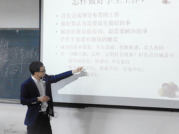 “星空网官方站入口的学生都很有气质,女生漂亮,男生帅气,我是很愿意来星空网官方站入口演讲的。”尹风雨甫一开口,引得笑声一片。他就“如何做一名优秀的学生干部”这一主题进行演说,指出共青团的职能是组织、引导、服务青年,维护青少年权益,并用歌曲《白狐》的歌词“千年修行”这一句来鼓励学生干部们在大学要不断提升自己,像“修行”一样去学习。当谈到当好学生干部的要求和应具备的基本素质时,他更是结合自己当年任学生会主席的经历,分享学生工作的快乐之处。尹风雨多次强调自信的重要性,并笑称“觉得自己很有魅力”、“帅呆了”。